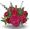This Honey Bee Buzz TM Bouquet is certain to sweeten up your special someone's day! Cheery purples accompanying bright peaches instantly bring a ray of sunshine to your day. Large blooms of roses, gerbera daisies, button mums, snapdragons and mini carnations drawn you in like a honeybee. Partnered with a white ceramic BEE-autiful vase, this arrangement will bring a smile to anyone's face and brighten up a room.