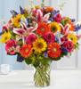 Gorgeous garden selected flowers are gathered together in a cylinder vase. This arrangement has all our spring and summer favorites: sunflowers, gerbera daisies, stargazer lilies, roses, delphinium and so much more!