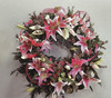 This stunning wreath encompasses great beauty with its stargazer lilies, vibrant greens, seeded eucalyptus and sheer ribbon.
