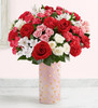 Our Precious Love Medley TM Bouquet features large luscious red roses accompanied by bursts of mini roses in pinks and whites, white delphinium, and carnations to make a very full bountiful bouquet. Better still? The stunning pink marble vase with gold hearts tie it all together with an extra touch of whimsy and romance.