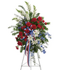 What a touching tribute this standing spray is! It includes red carnations, white lilies and snapdragons, blue delphinium and various greens.
