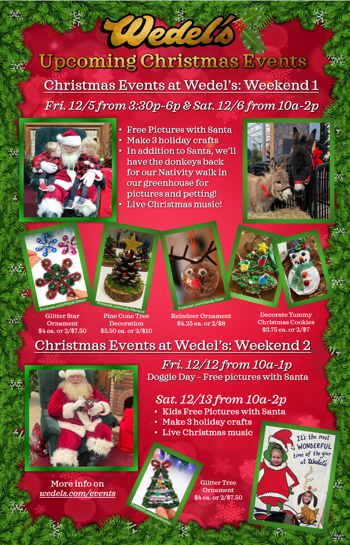 Check out our upcoming Christmas Events At Wedel's! Come in 12/5th and 6th and 12/12th and 13th for tons of holiday fun!