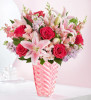 A soft pink swirl vase is bursting with stargazer lilies, red roses and purple stock in our Mother's Embrace bouquet.